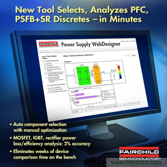 飛兆半導體公司最近將Power Supply WebDesigner (PSW) - 一款在線設計和模擬工具,可在一分鐘內提供完整的設計–進一步強化,引入傳動系分立式(MOSFET/IGBT/整流器)器件功率損耗和效率分析工具。
