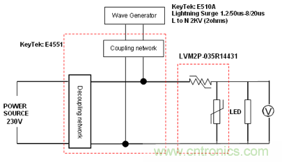 2Pro AC 器件一個常見的應用是 LED 照明,其雷擊的保護要求都小于 2kV surge,2Pro AC 正好可以防護 2kV 的雷擊。下圖是不久前網友調試的一塊客戶 LED 電路板示意圖,雷擊要求是 2kV,把 2Pro AC 放置于 LED lighting 電路輸入端,再加上雷擊波形發生器和交流耦合。