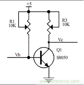 2、當我們調節可調電阻,R1,使R1=4.3K時,通過歐姆定律我們可以計算得到,Ib=(5-0.7)/4.3K=1mA,那我們就可以計算出IC=Hfe*Ib=10mA,假如這個時候我調節R3,使R3=1K歐姆,通過計算我們可以得到Vc=5-(10mA*1K)=-5V,回出現-5V嗎,當然不會,因為沒有負壓,所以Vc的電壓會停留在0V,那這個時候我們再來看下Ic到底是多少?