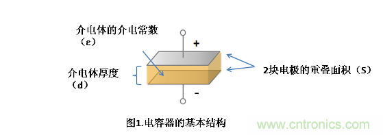 電容器用于儲存電荷,其最基本結構如圖1所示,在2塊電極板中間夾著介電體。
