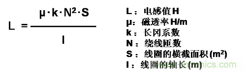 電感值的計算公式如下所示。卷數越多,磁場越強。同時,橫截面積變大,或改變磁芯都能夠使磁場增強。