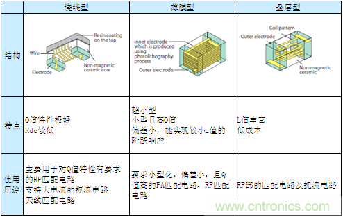 疊層型構造雖有3種結構且Q值也較低,但由于其L值偏差及規格、價格等整體的平衡性較好,因此被廣泛使用于RF的匹配電路、共振電路及扼流電路中。