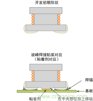 在 生產第一代LQN5N及第二代LQH32M時,雖會對部分混合IC基板進行回流焊接,但一般是對裝有插腳零部件的基板背面進行波峰焊接。其貼裝方法是將膠 粘劑涂在基板焊盤的中央部或貼片元件電極的中央部,待其固化后將其投入波峰焊接槽。與CR貼片元件相比,體積較大的LQH系列在受到焊錫流動阻力后易發生 脫落,因此在電極間中央部位設計了突起(稱為梯級磁芯)?,F在看來的話,是反向支架形狀。至今再也見不到這種結構。