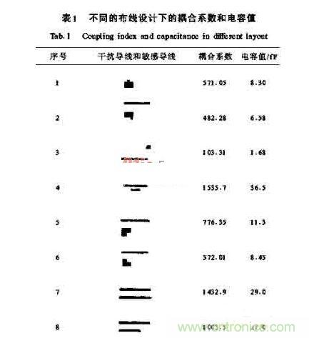 (1)印制板布局時,要將模擬電路區(qū)和數(shù)字電路區(qū)合理地分開,電源和地線單獨引出,電源供給處匯集到一點;PCB布線時,高頻數(shù)字信號線要用短線,主要信號線最好集中在PCB板中心,同時電源線盡可能遠離高頻數(shù)字信號線或用地線隔開。其次,可以根據(jù)耦合系數(shù)來布線,盡量減少干擾耦合。(見表1)