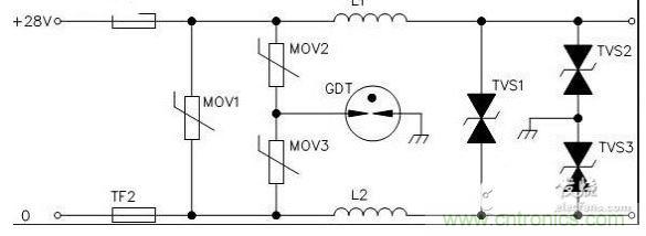 采用常規的兩級設計方式,第一級用來吸收較大的浪涌,后級采用TVS來對殘壓進一步的吸收。第一與第二級之間采用電感進行退耦,起到延時的作用,這樣可以保證MOV可以比TVS先動作。u 前級共模采用壓敏與氣體管相結合的方式;u 前級差模采用壓敏、溫度保險相結合的方式,溫度保險可以消除壓敏失效短路時火災的發生。