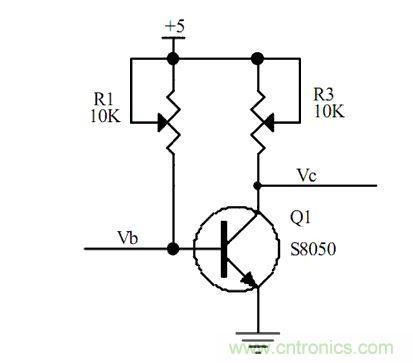 2、當我們調節可調電阻,R1,使R1=4.3K時,通過歐姆定律我們可以計算得到,Ib=(5-0.7)/4.3K=1mA,那我們就可以計算出IC=Hfe*Ib=10mA,假如這個時候我調節R3,使R3=1K歐姆,通過計算我們可以得到Vc=5-(10mA*1K)=-5V,回出現-5V嗎,當然不會,因為沒有負壓,所以Vc的電壓會停留在0V,那這個時候我們再來看下Ic到底是多少?