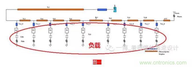 容性負(fù)載?是負(fù)載呈容性,還是帶容性的負(fù)載?呵呵,這不一個意思嘛,中國的語言,難怪老外覺得很難搞懂,自己人都被繞暈了。負(fù)載怎么會呈容性呢?這個主要是在多負(fù)載的情況下,如下圖一所示,由于分支和負(fù)載較多,不可避免的會增加過孔來連通信號,普通過孔是呈容性的,其次還有芯片封裝上的寄生電容(約0.33~0.44pF),另外還有Die上的寄生電容(約0.77~2.12pF),所有的這些電容會降低信號線的有效特征阻抗。