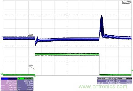 圖3展示了對(duì)0.9V輸出(被15A的負(fù)載階躍以300A/us的速率擾動(dòng))的瞬態(tài)響應(yīng)。