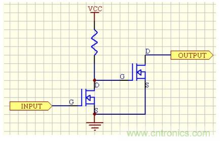 我們將圖1簡化成圖2的樣子。圖2中的開關(guān)受軟件控制,“1”時(shí)斷開,“0”時(shí)閉合。很明顯可以看出,當(dāng)開關(guān)閉合時(shí),輸出直接接地,所以輸出電平為0。而當(dāng)開關(guān)斷開時(shí),則輸出端懸空了,即高阻態(tài)。這時(shí)電平狀態(tài)未知,如果后面一個(gè)電阻負(fù)載(即使很輕的負(fù)載)到地,那么輸出端的電平就被這個(gè)負(fù)載拉到低電平了,所以這個(gè)電路是不能輸出高電平的。