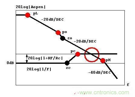 F中的極點(diǎn)和零點(diǎn)在1/F中相對(duì)應(yīng)為零點(diǎn)zc和極點(diǎn)pc,zc=1/2pi(RF+Rc)Cc,pc=1/2piRcCc,兩者之間的增益差為1+RF/Rc,從而使pc之后的1/F提升了1+RF/Rc,使1/F遠(yuǎn)離pH。