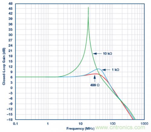 圖1的示例顯示小信號閉環增益與ADA4807-1電壓反饋型放大器頻率響應的實驗室結果,采用同相增益為2的配置,反饋電阻為499 ?、1 k?和10 k?。數據手冊建議RF值為499 ?。