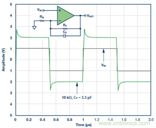 圖4. 3.3 pF反饋電容CF的脈沖響應模擬結果。VS = ±5 V,G = 2,RF = 10 k?且RLOAD = 1 k?