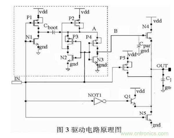 圖3中給出了驅動電路的電路圖。驅動電路采用Totem輸出結構設計,上拉驅動管為NMOS管N4、晶體管Q1和PMOS管P5。下拉驅動管為NMOS管N5。圖中CL為負載電容,Cpar為B點的寄生電容。虛線框內的電路為自舉升壓電路。