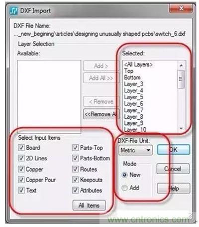 圖 5:PCB 設計工具(如這里介紹的 PADS)需要能夠使用 DXF 格式控制所需的各種參數。