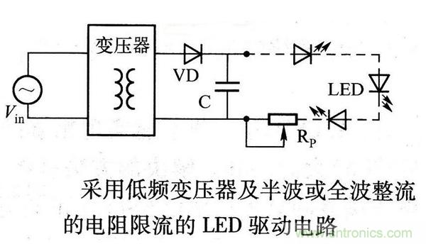 該電路的優(yōu)點是:電路簡單、成本低。缺點是:體積大、電壓驅(qū)動模式,LED亮度會隨著供應電壓的變化而有所改變;無法提供恒流輸出;突波電流較大。這種LED驅(qū)動電源的電路結(jié)構(gòu)非常簡單,只需要一個低頻變壓器、整流器、濾波電容,以及一個用于調(diào)整亮度的可變電阻。串聯(lián)LED的數(shù)目主要由變壓器的匝數(shù)比所決定。一旦選用變壓器的匝數(shù)比固定之后,若要得到一樣的亮度9就很不容易再改變LED的數(shù)目。