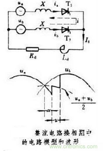 ③重疊導電現(xiàn)象和電壓降:圖5所示為變壓器漏抗存在時對整流電路波形的影響。當T1處于導通狀態(tài),給直流側(cè)提供電流Id時,觸發(fā)T2,若ud<ub,則T2變?yōu)閷顟B(tài)。但由于交流側(cè)存在漏感,T2中的電流并不立即變?yōu)镮d,T1中的電流也不立即降為零,因此出現(xiàn)T1和T2同時導通的狀態(tài),這種狀態(tài)稱為換相重疊現(xiàn)象,這段時間以相角計算,稱換相重疊角,用u表示。在重疊期中,輸出電壓為(ud+ub)/2,與不考慮漏抗時相比,輸出電壓降低了(ub-ud)/2。重疊期內(nèi)直流電流一定的話,則T1、T2回路中流過環(huán)流i,這時α相電流id=Id-i將逐漸減小,而b相電流ib=i,當ib增加到Id時,id就等于零,這樣就完成了換相過程。關于電流i,2&TImes;di/dθ=ub-ud式成立,由于在控制角α處i=0,在(α+u)處i=Id,故有2&TImes;Id=(ub-ud)·u。因此,交流電流在一周期內(nèi)換相一次引起的平均輸出電壓降為dx=XId/2π。重疊角u隨α不同而不同,但電壓降是與α無關的常數(shù)。在三相橋式電路中,由于一周內(nèi)換相6次,換相壓降nx=6XId/2π,式中X是每相的電抗。