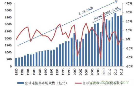 這是因為全球連接器市場已經連續近40年來持續增長,據Bishop&Associate數據,全球連接器市場從1980年的594億元增長到2016年的3643億元,復合增長率高達5.2%,近十年來增速放緩,復合增長率為2.6%。從年度來看2016 年全球連接器市場達到 544 億美元,同比增長 4.5%,依然保持穩健成長的態勢。中國市場表現更優,增速約為全球市場增速 2 倍,同比增長10%,達到159.4億美元,占全球比例接近30%,遠高2010年的 20%。雖然全球連接器市場2014年之后出現暫時性下滑,但隨著中國經濟觸底反彈以及智能化升級,必將繼續帶動這一產業向前快速發展。