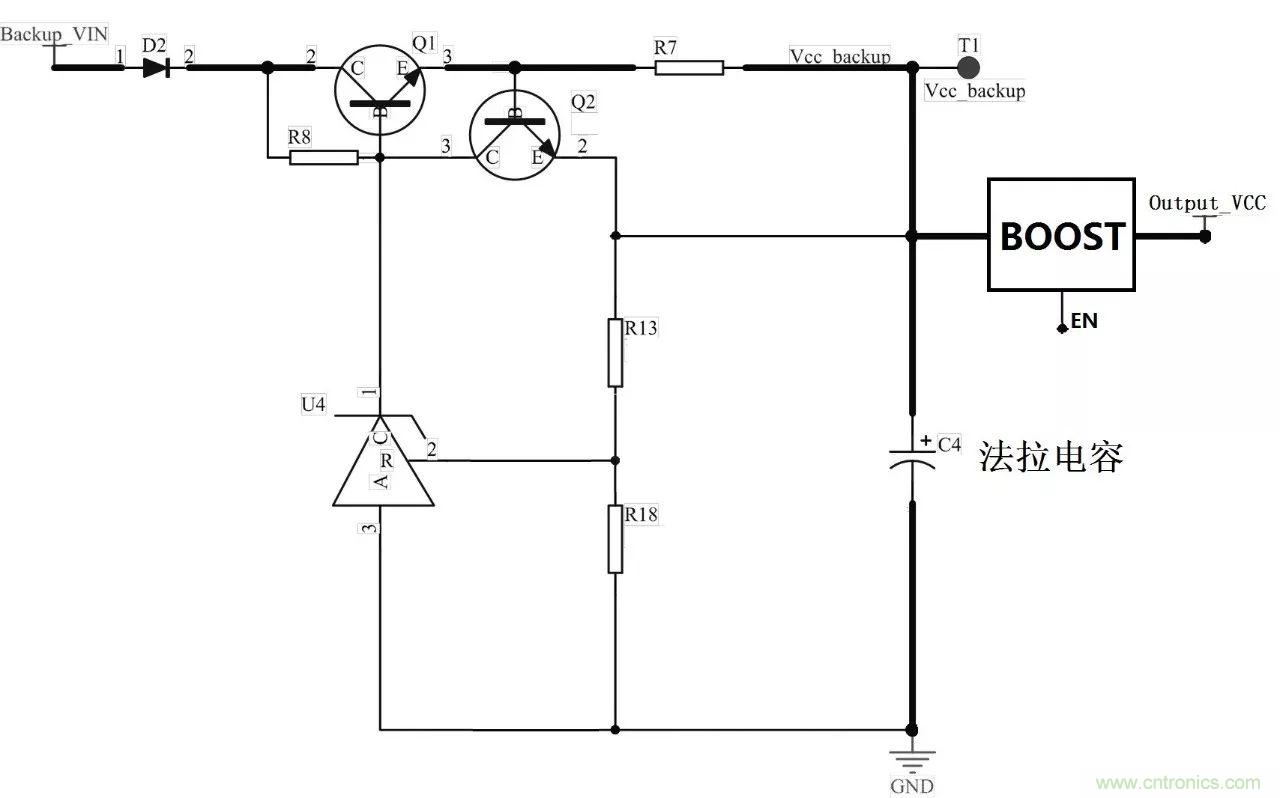 若對電壓高于法拉電容本身電壓上限的電源系統提供掉電續航時,Vcc_backup端需通過BOOST升壓電路后以實現,且注意系統正常時(充電過程中)關斷EN腳。