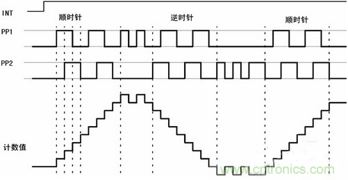 方向盤轉(zhuǎn)角傳感器的輸出為正交編碼脈沖。正交編碼脈沖包含兩個脈沖序列,有變化的頻率和四分之一周期(90°)的固定相位偏移,如圖1所示。通過檢測2路信號的相位關(guān)系可以判斷為順時針方向和逆時針方向,并據(jù)此對信號進行加/減計數(shù),從而得到當(dāng)前的計數(shù)累計值,也即方向盤的絕對轉(zhuǎn)角,而轉(zhuǎn)角的變化率即角速度,則可通過信號頻率測出。另外,方向盤轉(zhuǎn)角傳感器有一個零位輸出信號,當(dāng)方向盤在中間位置時,該信號輸出0V,否則輸出5V,通過該信號,可對絕對轉(zhuǎn)角進行在線校準(zhǔn)。