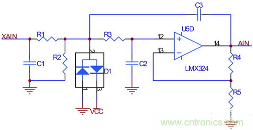 根據(jù)前面部分介紹的輪速傳感器信號特點,設(shè)計接口電路如圖3所示。