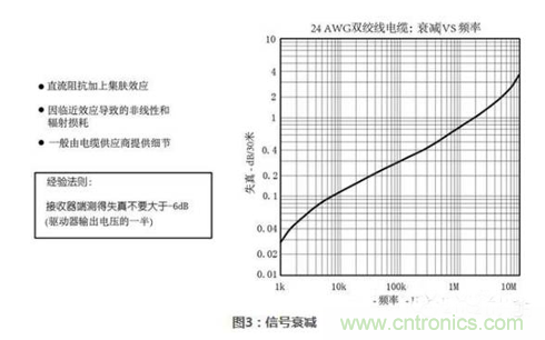 2.2信號衰減和失真一個有用的常識是:在最大信號速率(單位:Hz)通訊的條件下,允許信號衰減-6dB。一般情況下,電纜供應商會提供信號衰減圖表。圖3所示的曲線顯示了24-AWG電纜衰減和頻率的關系。