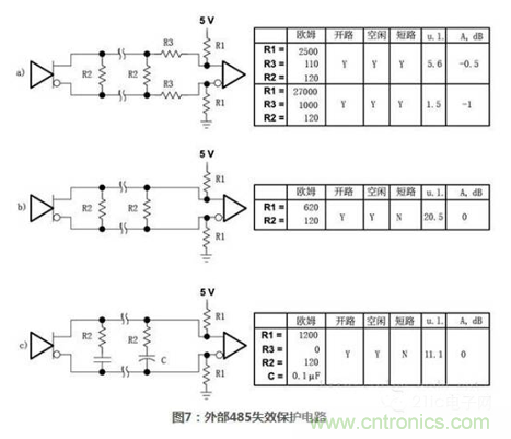使用這樣的內部上下拉電阻允許總線不進行終端匹配,但是會顯著的降低最大信號速率和可靠性。圖7給出了一些485接口通用外置失效保護電路,每個電路都盡力維持接收器輸入端電壓不小于最小臨界值并在一個或多個故障條件(開路、空閑、短路)下,維持一個已知的邏輯狀態。