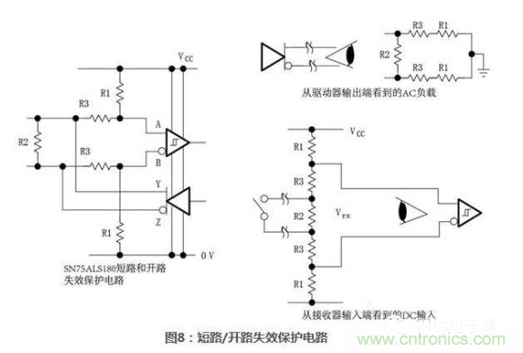 在這些電路中,R2代表傳輸線阻抗匹配電阻,并成為電壓驅動器的一部分:產生穩態偏置電壓。這里假設每個接收器代表1個單位負載。圖7右半部分的表格中列出了一些典型電阻和電容值、提供的失效保護類型、使用的單位負載個數和信號失真。在下一節中,會通過對短路失效電路中的電阻值計算,來說明如何修改這些電阻值以便適用于特定設計。