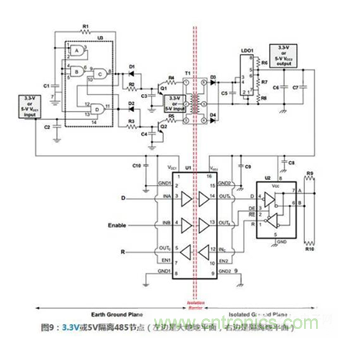 此外,使用低功耗計數,可以使用小型隔離變壓器。如圖9所示,收發器使用SN65HVD10,當然任何TI公司3.3V或5V RS485收發器、3.3-V TIA/EIA-644 LVDS或者3.3-V TIA/EIA-899 M-LVDS收發器都可以使用這個電路。2.4.2操作原理圖9所示的例子可用于3.3V或5V,電源使用變壓器隔離,數據信號采用數字隔離器隔離。因為485收發器需要隔離電源,可調LDO穩壓器必須被隔離。