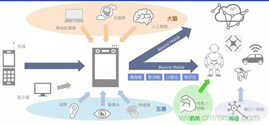 他指出按照這個原理疊加,如果再疊加人的肌肉----類似一些電機控制執(zhí)行器件,就形成了機器人的概念,再把低功耗小型化智能運用就形成IOT物聯(lián)網(wǎng)概念,隨著技術的在進步,智慧手機會超越了手機行業(yè)的范疇,逐步進入到各個其他領域。如車載、機器人、穿戴設備,給其他周邊設備、周邊行業(yè)等,帶來革命性的產(chǎn)品形態(tài)變化。