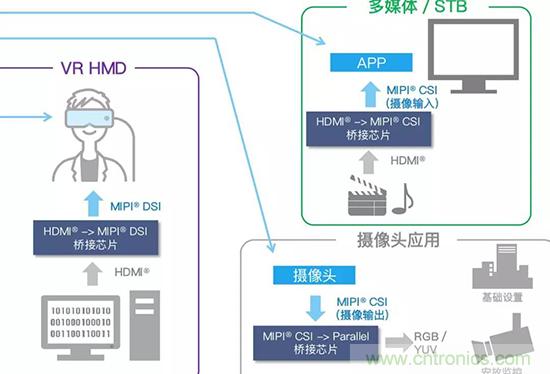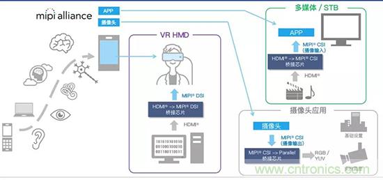 例如VR技術,VR是使用高清晰的小型顯示設備,其實這是從原來的智能手機顯示屏發(fā)展而來。智能手機主要使用MIPI等接口方式,但是VR是從PC轉(zhuǎn)變來的,它采用了大量高清晰度圖像。主要使用HDMI接口。隨著手機進入到VR領域,就會遇到接口不統(tǒng)一的挑戰(zhàn)。