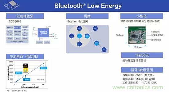 針對這樣的應用場景,東芝推出了整合了控制芯片的藍牙芯片,是迄今實現(xiàn)的功耗最低藍牙芯片,新的藍牙芯片可以實現(xiàn)組網(wǎng),可應用到體積很小的設備上,且可以通過新版本,實現(xiàn)長達600米通信距離,最大電流是3.3毫安,一顆鈕扣電池可以使用3到4年。