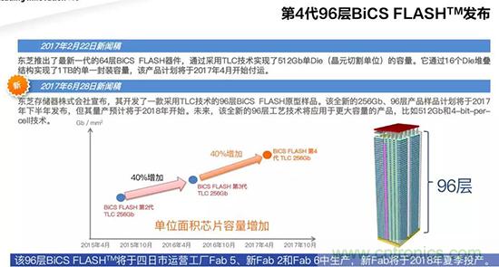 東芝電子(中國)有限公司副總經(jīng)理野村尚司表示東芝在2017年已經(jīng)推出了最新一代的64層BiCS FLASH器件,通過采用TLC技術實現(xiàn)了512Gb單Die(晶元切割單位)的容量。它通過16個Die堆疊 結(jié)構實現(xiàn)了1TB的單一封裝容量,該產(chǎn)品計劃于2017年4月開始付運。