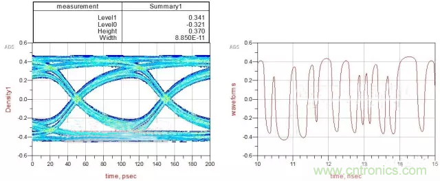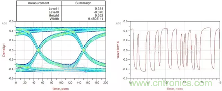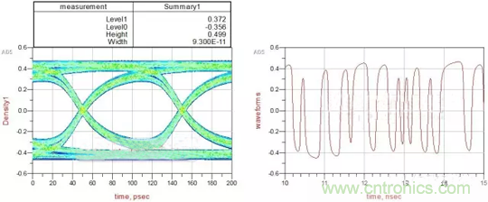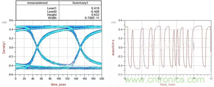 從結果可以看到:眼圖的寬度為97ps,高度為0.652V,信號的峰值為0.479V。