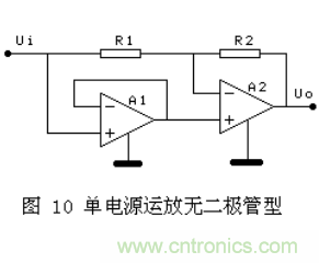 圖10是利用單電源運放的跟隨器的特性設計的,單電源的跟隨器,當輸入信號大于0時,輸出為跟隨器;當輸入信號小于0的時候,輸出為0.使用時要小心單電源運放在信號很小時的非線性.而且,單電源跟隨器在負信號輸入時也有非線性。