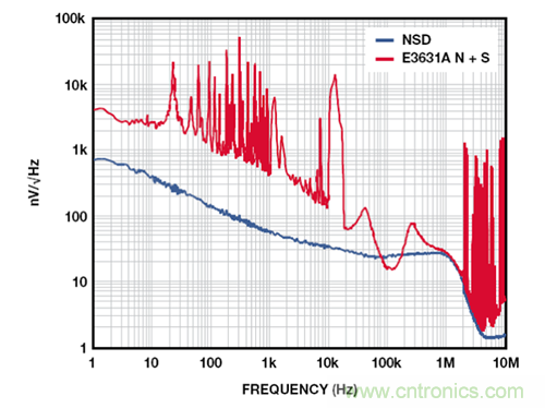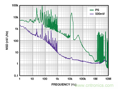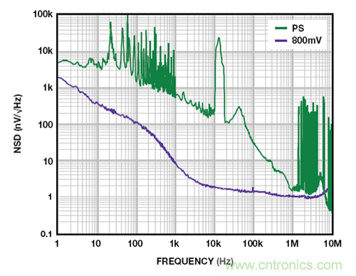 如 ADM7150 超低噪聲、高 PSRR 調節器一類的新型 LDO 實際上級聯了兩個 LDO,因此,結果得到的 PSRR 約為各個級之和。這些 LDO 要求略高的裕量電壓,但能夠在 1 MHz 條件下實現超過 60 dB 的 PSRR,較低頻率下,PSRR 可以遠超 100 dB。圖 7 所示為一個 5 V 的 ADM7150 的噪聲頻譜密度,其負載電流為 500 mA,裕量為 800 mV。10 Hz 至 100 kHz 范圍內,輸出噪聲為 2.2 μV rms。隨著裕量降至 600 mV,整流諧波開始顯現,但當輸出噪聲升至 2.3 μV rms 時,其對噪聲的影響很小。