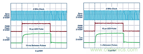 圖2. 無論PWM關斷時間是多少,圖1所示并聯LED驅動器的3 A相機閃光波形看起來相同。波形顯示,(a) 10 ms之后和(b) 1 s之后的10μs脈沖是相同的。經過一天或更長的PWM關斷時間之后,LT3932 LED閃光波形看起來也相同。