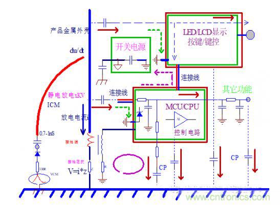 1、靜電釋放于機殼,由于沒有理想的接地,會在機殼上建立電壓V。