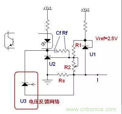 TL431 價格低廉,在開關電源的反饋環路大量應用,但其FB電壓為2.5V,直接用做電流反饋時要很大的采樣電阻,浪費電壓。圖中用兩個TL431實現電流反饋,可以用比較小的采樣電阻實現精密的電流反饋,如果還有電壓反饋網絡,再并上U3的電壓反饋電路。
