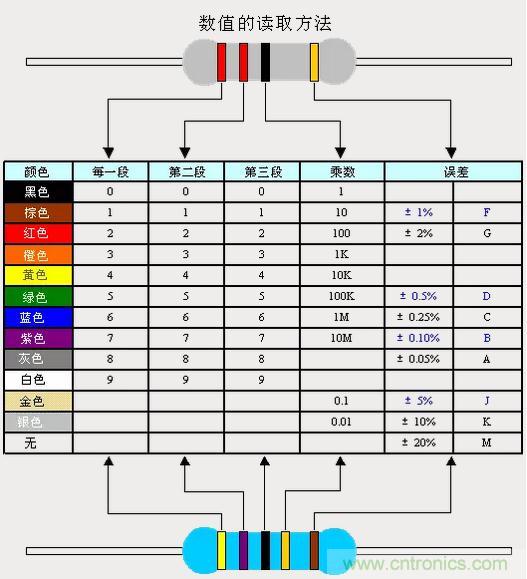 黑-0、棕-1、紅-2、橙-3、黃-4、綠-5、藍-6、紫-7、灰-8、白-9、金-±5%、銀-±10%、無色-±20%