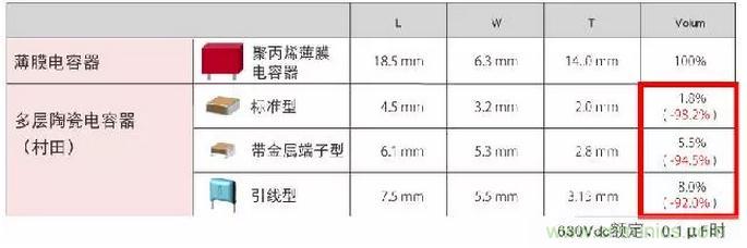 多層陶瓷電容器和薄膜電容器同一電壓、同一容量的比較表。可知多層陶瓷電容器非常小型化。