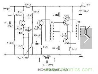 負反饋電路雖然會削弱放大器的輸人信號,降低放大器的增益,但可以減小失真,提高放大器的穩定性,所以適當加人一些負反饋,可以大幅度提高放大器的質量。一部性能優良的擴音機或收音機,常常采用多種形式的負反饋電路。