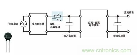 各種電源電路和外圍電路緊湊地集成到一起的內置電源稱為電源模塊。交流-直流電源模塊是由交流-直流整流電路、直流-直流轉換器以及少量外部零部件組成的電源,可以形成一個節省空間的優化電源系統。插入一個NTC熱敏電阻(電源熱敏電阻)可以有效地限制在通電時施加到輸入和輸出電容器上勵磁涌流。