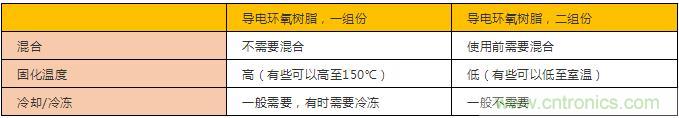 導電環氧樹脂的種類一般有兩種,一組份(One Part)導電環氧樹脂(只有一種成分)與二組份(Two Part)導電環氧樹脂(兩種成分,使用前需要混合)。