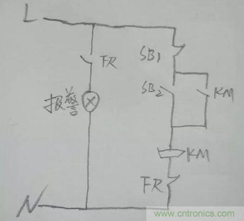 簡單描述一下這個圖。當電動機工作正常的時候,熱繼電器的常閉觸點接通,常開觸點斷開,報警裝置不工作。如果電機出現故障,熱繼電器內部的熱元件把常閉點斷開的同時,熱繼電器的常開點閉合,報警裝置形成回路,報警響起,提醒操作人員及時檢修。