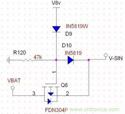 由PMOS來進行電壓的選擇,當V8V存在時,此時電壓全部由V8V提供,將PMOS關閉,VBAT不提供電壓給VSIN,而當V8V為低時,VSIN由8V供電。注意R120的接地,該電阻能將柵極電壓穩定地拉低,確保PMOS的正常開啟,這也是前文所描述的柵極高阻抗所帶來的狀態隱患。D9和D10的作用在于防止電壓的倒灌。D9可以省略。這里要注意到實際上該電路的DS接反,這樣由附生二極管導通導致了開關管的功能不能達到,實際應用要注意。