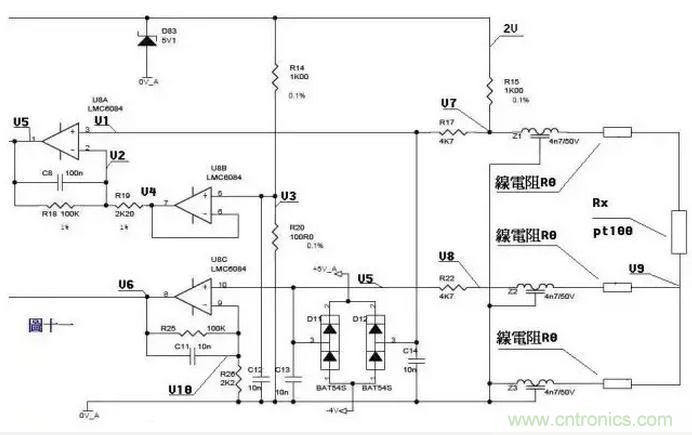 來一個復雜的,圖十一是一個三線制PT100前置放大電路。PT100傳感器引出三根材質、線徑、長度完全相同的線,接法如圖所示。有2V的電壓加在由R14、R20、R15、Z1、PT100及其線電阻組成的橋電路上。Z1、Z2、Z3、D11、D12、D83及各電容在電路中起濾波和保護作用,靜態分析時可不予理會,Z1、Z2、Z3可視為短路,D11、D12、D83及各電容可視為開路。 由電阻分壓知, V3=2*R20/(R14+20)=200/1100=2/11 ……a 由虛短知,U8B第6、7腳 電壓和第5腳電壓相等 V4=V3 ……b 由虛斷知,U8A第2腳沒有電流流過,則流過R18和R19上的電流相等。 (V2-V4)/R19=(V5-V2)/R18 ……c 由虛斷知,U8A第3腳沒有電流流過, V1=V7 ……d 在橋電路中R15和Z1、PT100及線電阻串聯,PT100與線電阻串聯分得的電壓通過電阻R17加至U8A的第3腳, V7=2*(Rx+2R0)/(R15+Rx+2R0) …..e 由虛短知,U8A第3腳和第2腳電壓相等, V1=V2 ……f 由abcdef得, (V5-V7)/100=(V7-V3)/2.2 化簡得 V5=(102.2*V7-100V3)/2.2 即 V5=204.4(Rx+2R0)/(1000+Rx+2R0) – 200/11 ……g 上式輸出電壓V5是Rx的函數 我們再看線電阻的影響。Pt100最下端線電阻上產生的電壓降經過中間的線電阻、Z2、R22,加至U8C的第10腳,由虛斷知, V5=V8=V9=2*R0/(R15+Rx+2R0) ……a (V6-V10)/R25=V10/R26 ……b 由虛短知, V10=V5 ……c 由式abc得 V6=(102.2/2.2)V5=204.4R0/[2.2(1000+Rx+2R0)] ……h 由式gh組成的方程組知,如果測出V5、V6的值,就可算出Rx及R0,知道Rx,查pt100分度表就知道溫度的大小了。