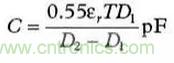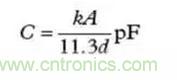 當尋找有問題的寄生源時,可能用得著幾個計算上述那些寄生電容尺寸的基本公式。公式(1)是計算平行極板電容器(見圖5)的公式。