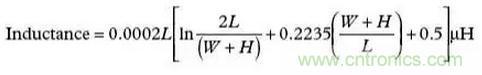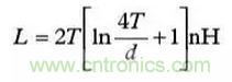 帶狀電感是另外一種需要考慮的寄生效應,它是由于印制線過長或缺乏接地平面引起的。式(2)示出了計算印制線電感(Inductance)的公式。參見圖6。