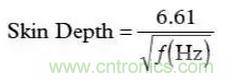 在高頻段,必須考慮一種稱為“趨膚效應”的現象。趨膚效應會引起電流流向導線的外表面——結果會使得導線的橫截面變窄,因此使直流(DC)電阻增大。雖然趨膚效應超出了本文討論的范圍,這里還是給出銅線中趨膚深度(Skin Depth)的一個很好的近似公式(以cm為單位):