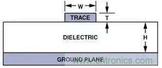 (6)H表示從接地平面到信號印制線之間的距離,W表示印制線寬度,T表示印制線厚度;全部尺寸均以密耳(mils)(10-3英寸)為單位。εr表示PCB材料的介電常數。